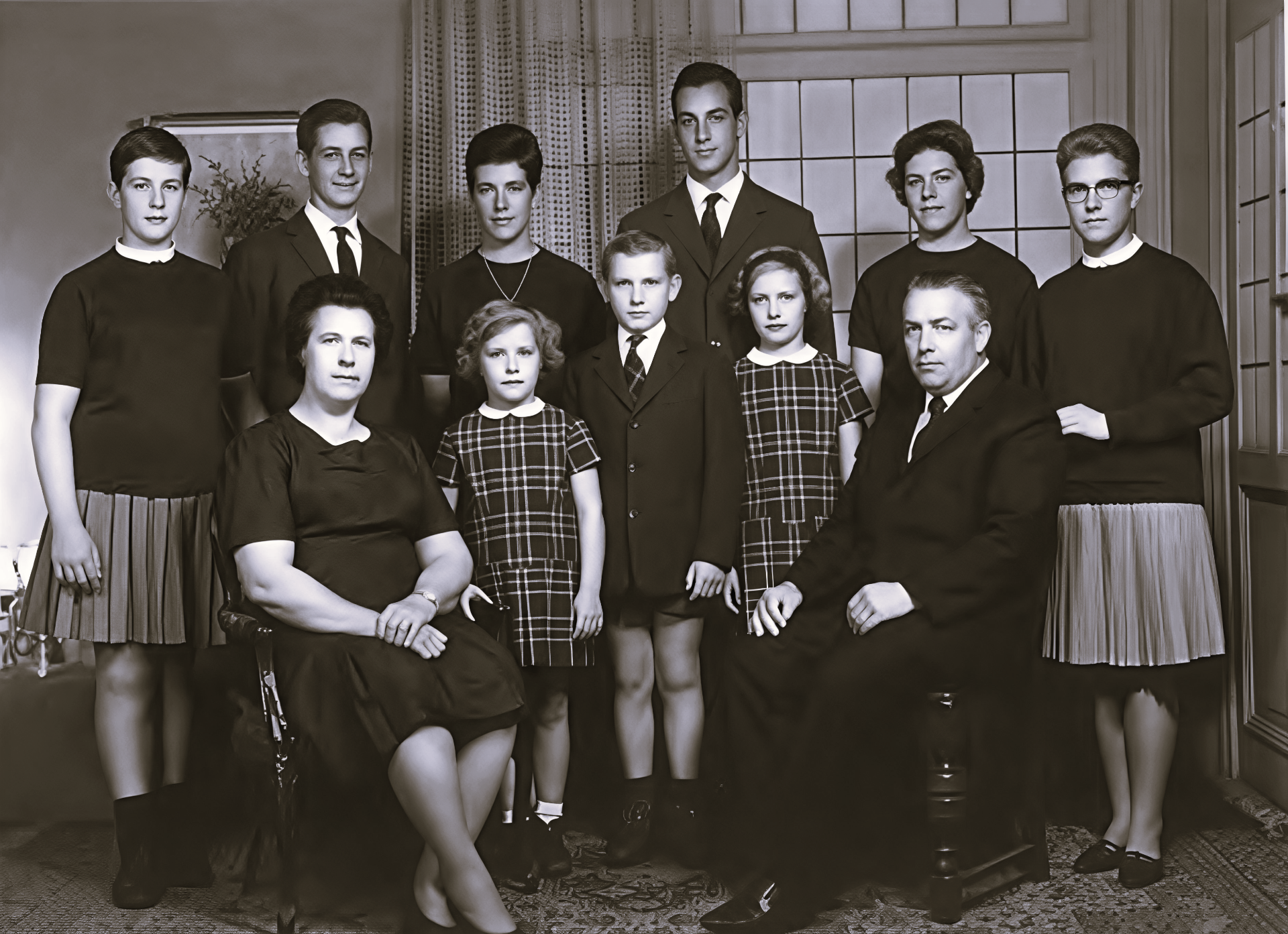 Foto van Gerard Devriendt en Martha Stevens met hun 9 kinderen, Rita, Mieke, Toon, Irène, Roger, Marie-José, André, Lieve en Leen